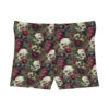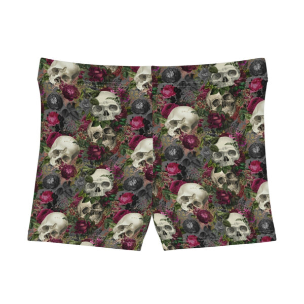 These skull floral print shorts have a Victorian/Gothic feel with an all over print. The 95% polyester and 5% spandex shorts are moisture-wicking to keep your cool even when working out. They have a brushed faux suede finish for a soft, smooth touch. Background of print is a dark gray with floral design in pink, black and green with off-white skulls. They have a skinny fit, so if in doubt, order up 1 size.