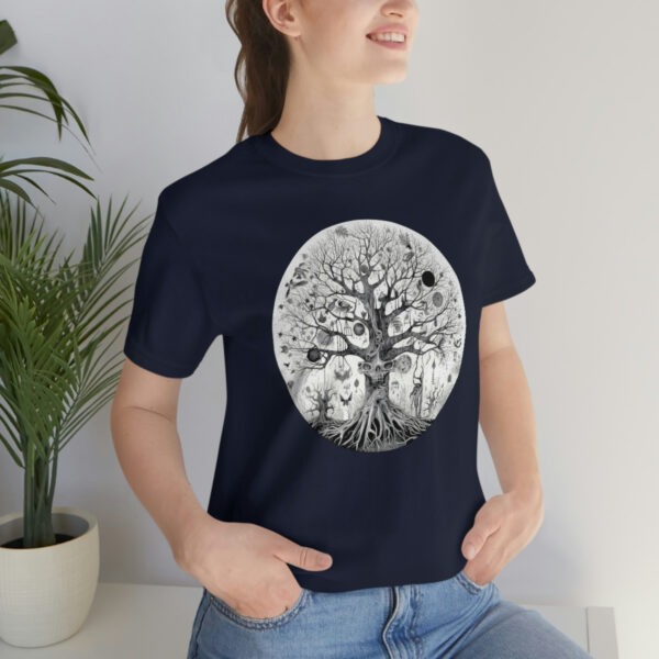 This stylized Tree of Life is haunted with skulls and other macabre symbols giving it a more gothic vibe. It is printed on a high quality tee-shirt in sizes for both men and women. A magical tree of life, symbol of the cycle of birth, death, and rebirth, with a touch of the macabre.