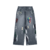 These wide legged distressed jeans are unisex with lots of splatter and distressed details including 2 color splashed skulls – one on front left thigh, the other on the back right leg.